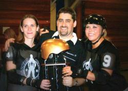 Coach Joel Samuels with Co–captain Mel Anoma aka Loquacious D(l) and Captain Holly Hunter, after winning the state championship last year. “I was at an art opening, and met one of the women who played on the team,” Samuels said of the 2007 encounter. “She said a newly formed roller derby team was looking for an announcer. That was very appealing to me as I had done some of that in college and really regretted I hadn’t pursued it.”